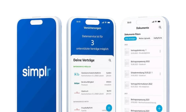 Simplr ist Dein digitaler Versicherungsordner, der es Dir ermöglicht, Deine Verträge und Unterlagen jederzeit und überall griffbereit zu haben. Die App informiert Dich über fällige Beitragszahlungen, erinnert Dich an Kündigungsfristen und überprüft jährlich Deine aktuellen Tarife auf mögliche Einsparungen.
